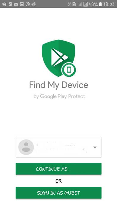 علاوه بر امکان استفاده از مرورگر برای دسترسی به موقعیت مکانی گوشی خود، شما می‌توانید از برنامه Find My Device بر روی سایر دستگاه ها نیز استفاده کنید و به عنوان مهمان وارد حساب کاربری خود شوید. بنابراین به منظور یافتن گوشی گم شده خود تنها کافیست تا پس از اجرای برنامه Find My Device بر روی دستگاه مورد نظر، گزینه Sing In As Guest را لمس کرده و اطلاعات حساب کاربری خود را وارد کنید. بدین ترتیب می‌توانید به قابلیت های به صدا در آوردن زنگ گوشی، مشاهده موقعیت مکانی، حذف اطلاعات و یا قفل کردن گوشی از راه دور دسترسی داشته باشید.